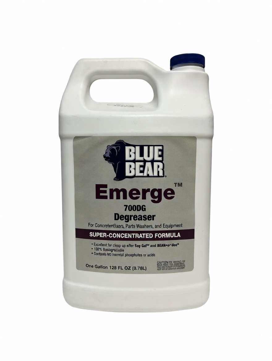 Blue Bear Emerge™ 700DG is a powerful, super-concentrated, eco-friendly degreaser designed to tackle the toughest oil, grease, dirt, and grime on hard surfaces. This versatile, biodegradable formula cuts through heavy buildup on concrete floors, metal parts, painted walls, asphalt, equipment, and more—without harsh acids, phosphates, or caustic chemicals.