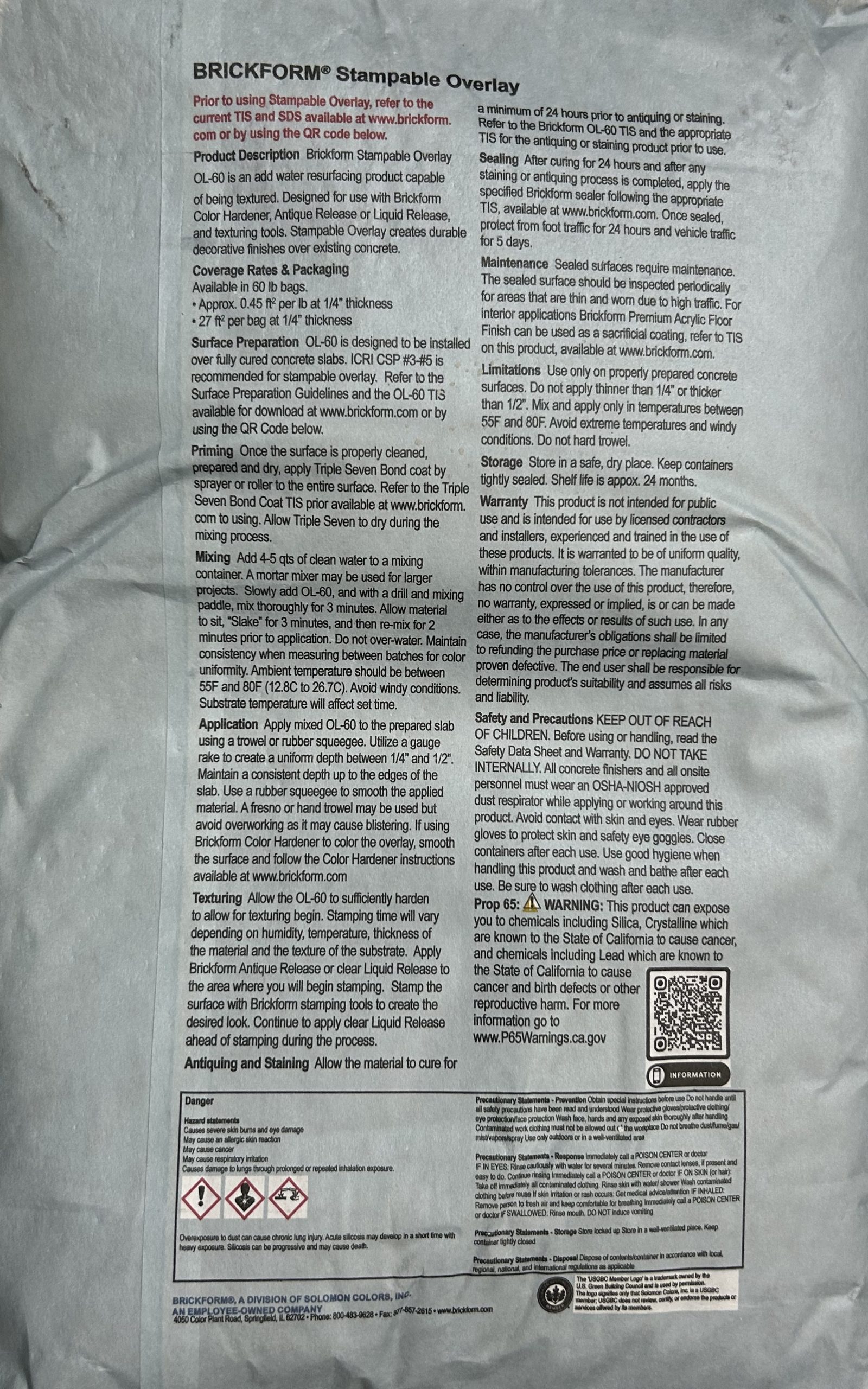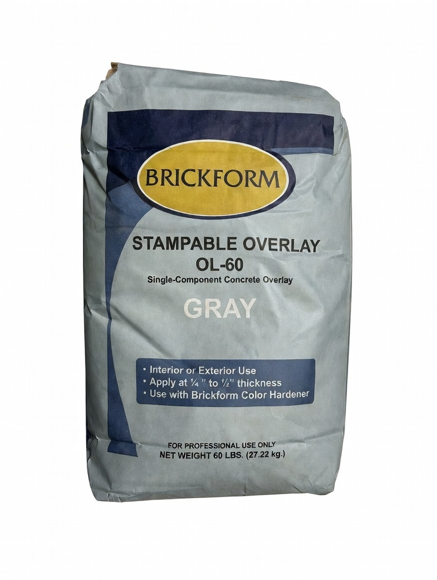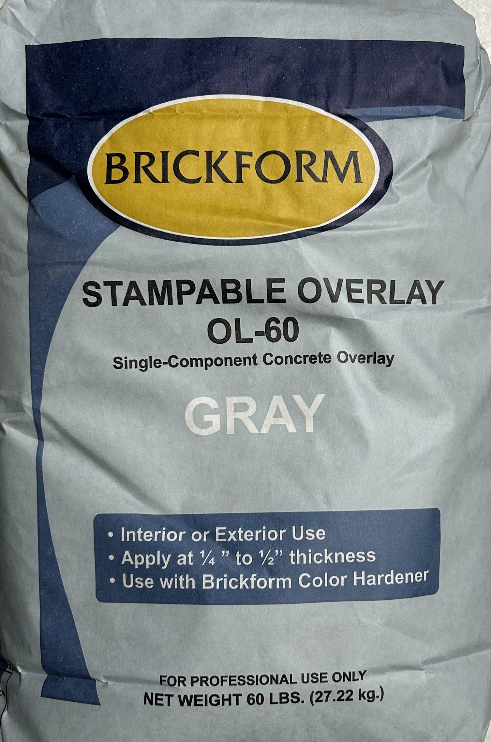 Transform worn or plain concrete surfaces into stunning, textured masterpieces without the hassle and expense of pouring a new slab. Brickform OL-60 Stampable Overlay is a professional-grade, single-component, gray premixed concrete overlay designed specifically for resurfacing and stamping existing interior or exterior concrete flatwork.
