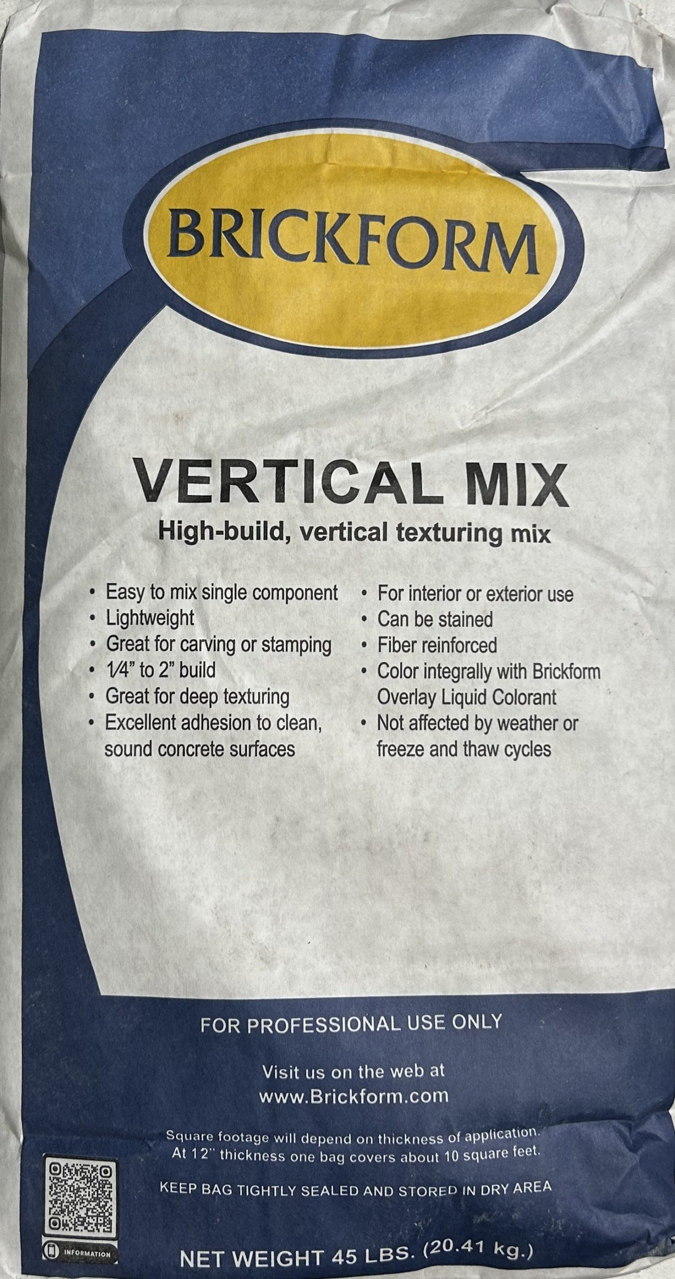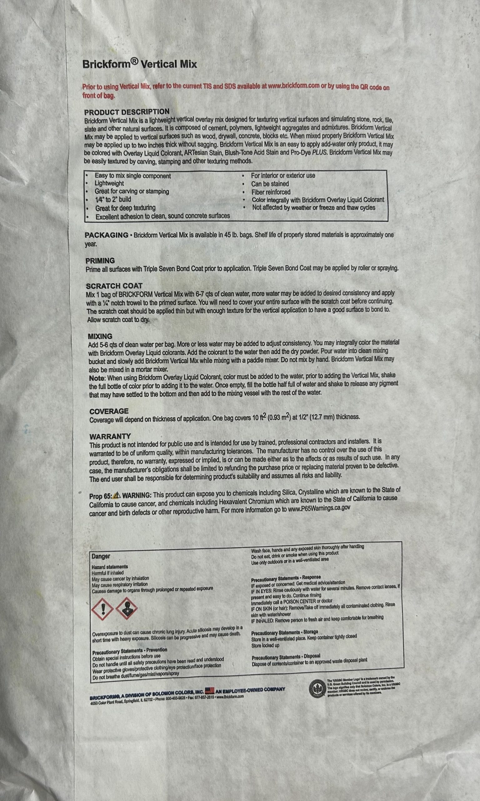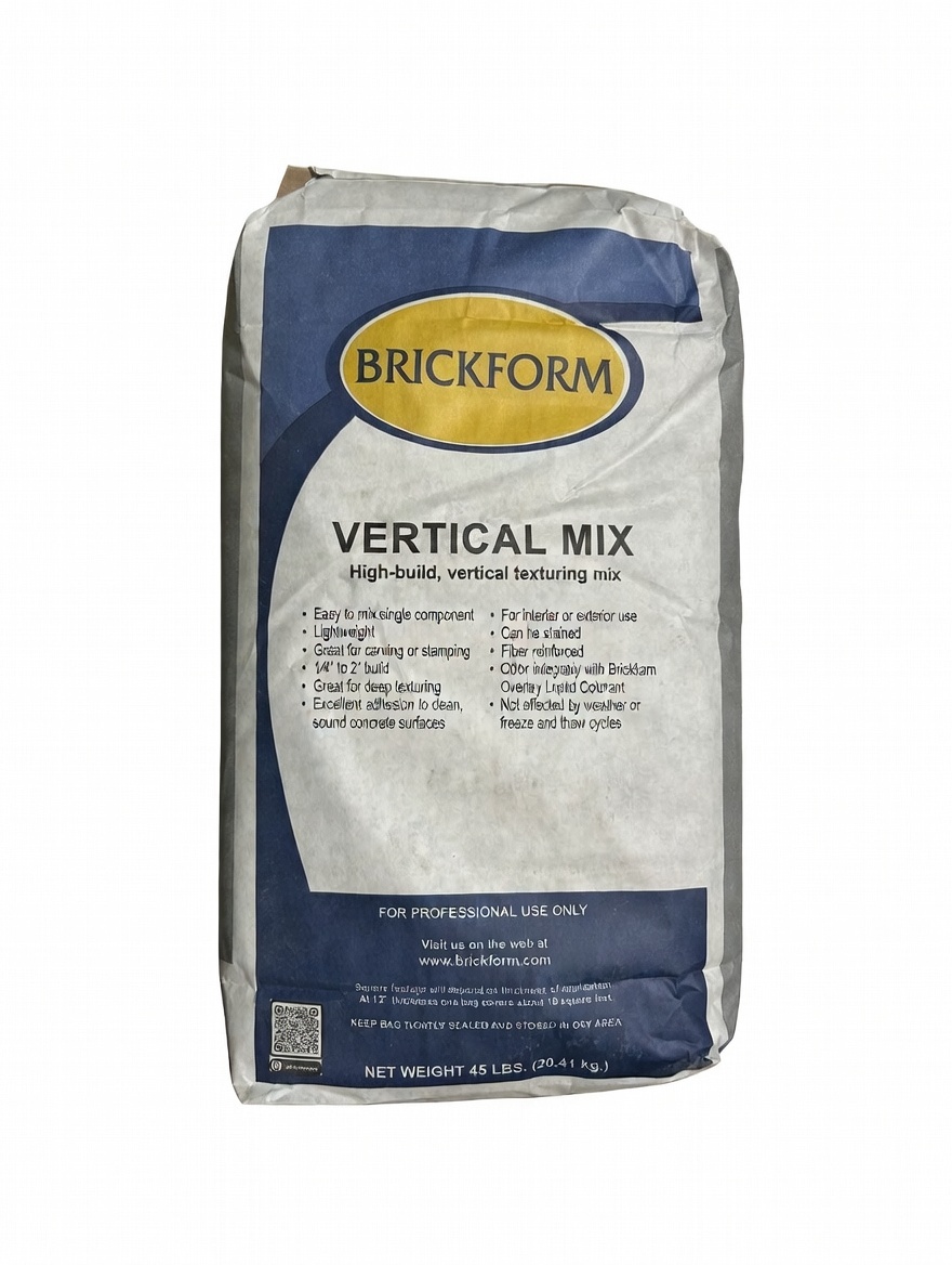 Achieve professional-grade vertical texturing with this high-build overlay mix. Lightweight and fiber-reinforced, it mixes easily with water and applies up to 2″ thick without slumping—ideal for hand-carving, stamping, or creating realistic stone, brick, rock, or custom designs on walls, fireplaces, facades, and more. Excellent adhesion to clean, sound surfaces like concrete, block, stucco, drywall (with proper prep), or wood. Suitable for interior and exterior use; withstands weather, freeze-thaw cycles, and moisture. Color integrally with liquid pigments or apply stains/sealers afterward for custom finishes. One 45 lb bag covers approximately 10 sq ft at ½” thickness. Perfect for contractors and enthusiasts looking for durable, deep-texture results.