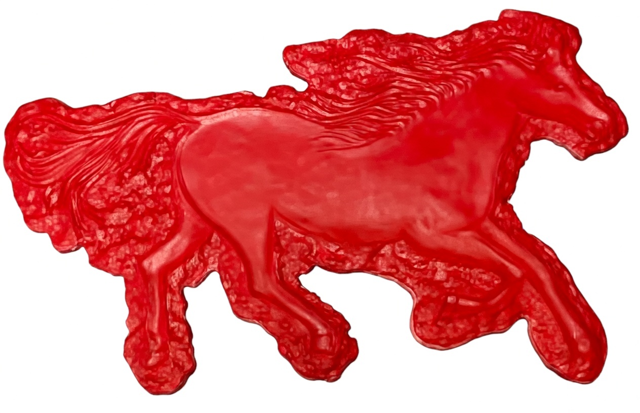 Proline Concrete Tools decorative accents – SA4001 Horse stamp. This beautiful stamp tool will create a hammered edge imprint of a galloping horse facing right (SA-4001) OR facing left (SA-4002), which can be antiqued, colored, or stained as desired. The size of this tool is approximately 17.5″ long x 12″ tall and is about 1/8″ in thickness. Note that the image imprinted in concrete shows the horse facing left (item SA-4002).