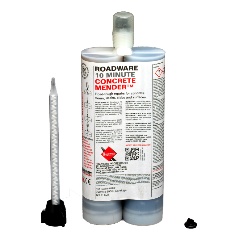 Roadware 10 Minute Concrete Mender is a two-part polyurethane that penetrates deep into concrete to make permanent repairs. Nearly thin as water, Concrete Mender actually injects itself into the matrix of the concrete and shores up the existing concrete as well as making the repair.   Permanent repair in 10 minutes. In just minutes after application, Concrete Mender cures to a tough 4500psi.