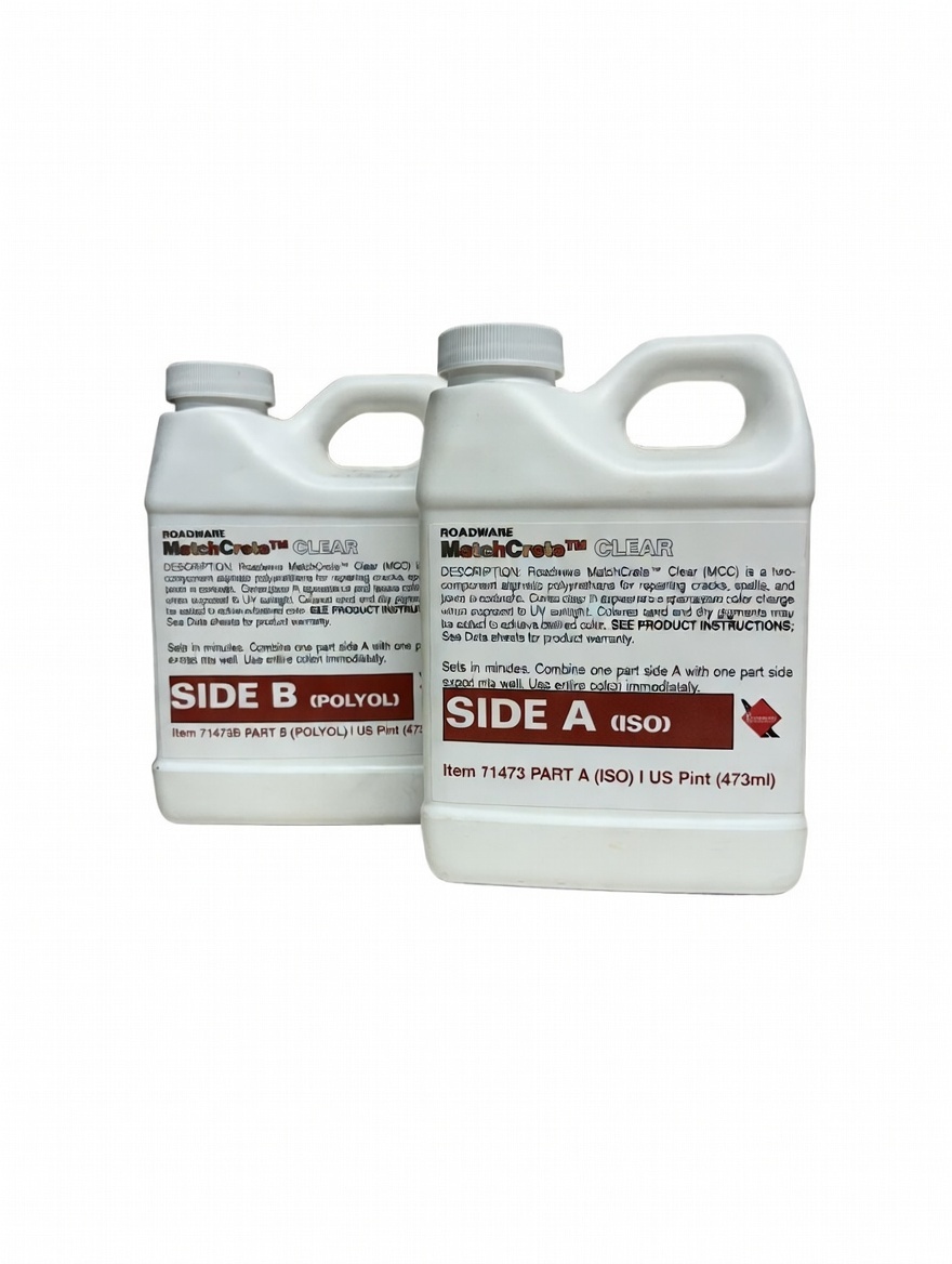 Roadware Matchcrete Clear is a two-component low viscosity polyurethane for repairing anything from hairline cracks to spalled concrete. Colored sand or pigments can be added to create UV stable repairs that can match any colored concrete. Each kit will fill 46-62′ of a hairline crack. One quart kit includes 1 pint each of parts A & B. Mix 1:1 prior to application.