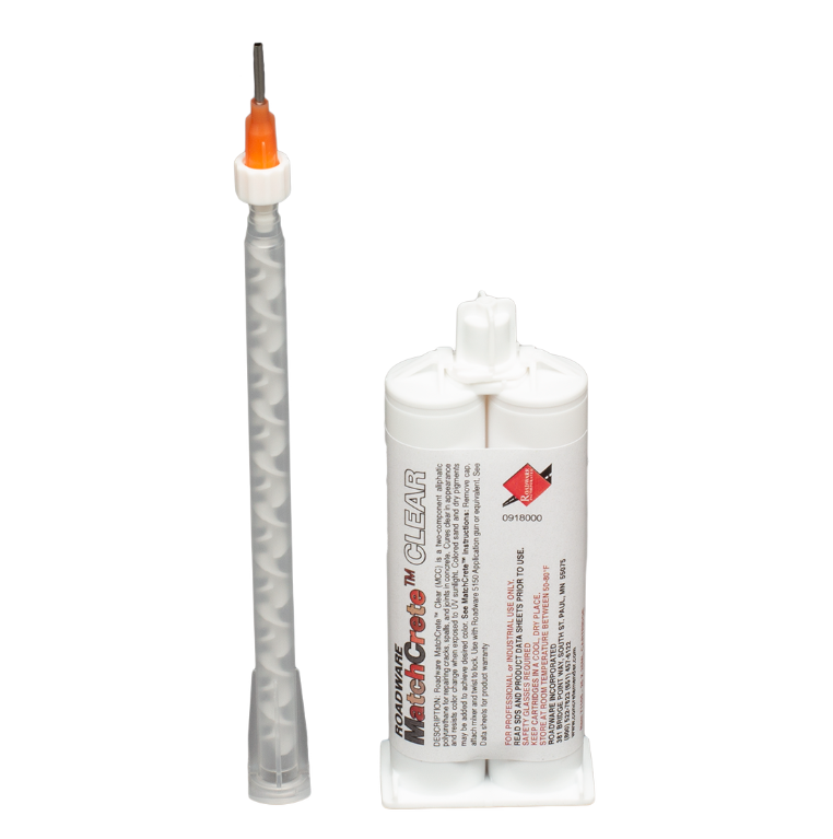Roadware Matchcrete Clear is a two-component low viscosity polyurethane for repairing anything from hairline cracks to spalled concrete. Colored sand or pigments can be added to create UV stable repairs that can match any colored concrete. Each kit will fill 3-4′ of a hairline crack. Requires 50mL mini applicator (sold separately)