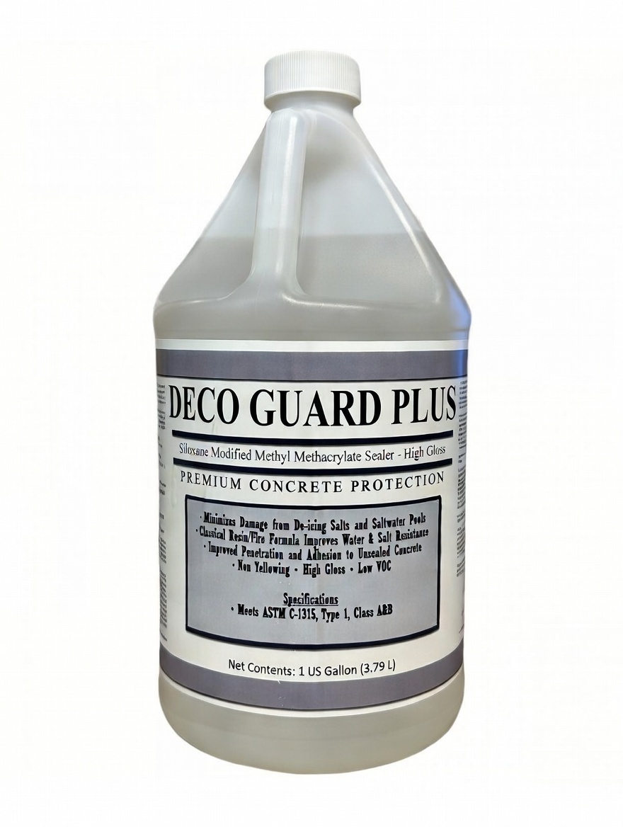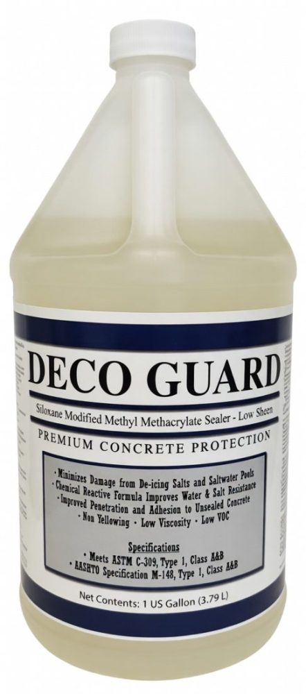 SDI Deco Guard is a non-yellowing, low sheen, Siloxane Modified Methyl Methacrylate with a low viscosity for better penetration on concrete substrates. Deco Guard’s unique Siloxane Modified Methyl Methacrylate formulation provides superior water and salt resistance compared to standard sealers used to protect exterior concrete. Improved resistance to de-icing road salts, pool decks with salt water pool systems, rain, sleet and snow are achieved due to our advanced chemical reactive formula. Deco Guard should cover 200-300 ft2 per gallon.