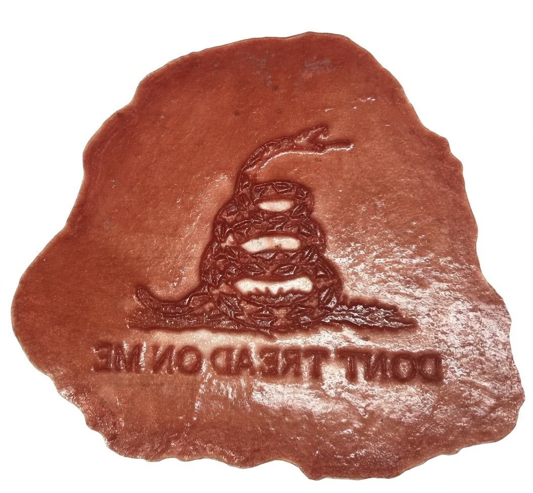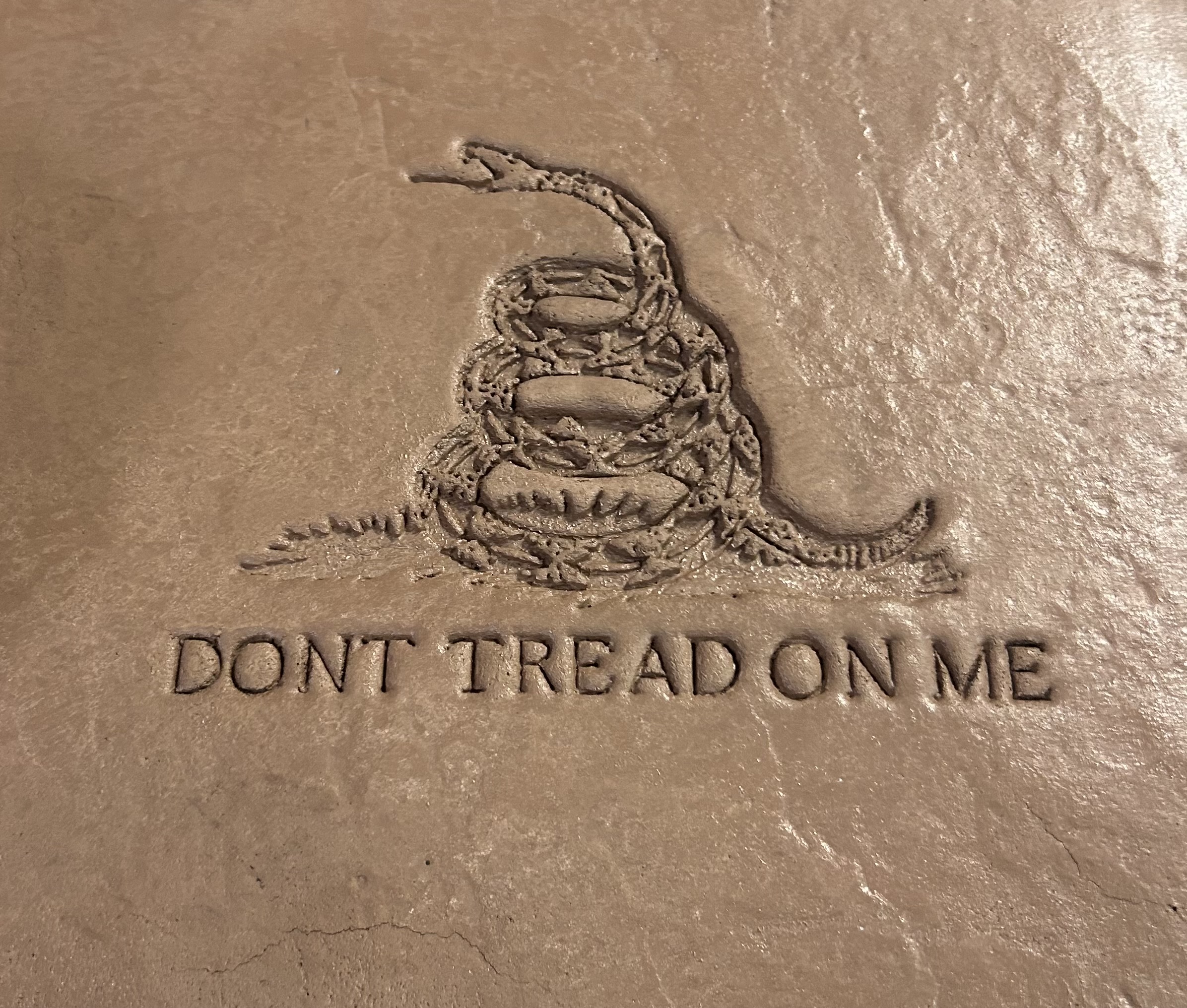 This custom stamp delivers deep, detailed impressions into fresh concrete, perfect for adding patriotic flair and historical pride to patios, driveways, walkways, pool decks, garage floors, stepping stones, borders, or custom accent areas. The intricate snake design and raised lettering create a striking, textured 3D effect that stands out beautifully—especially when highlighted with concrete stains, integral colors, or release agents for that authentic, weathered look.