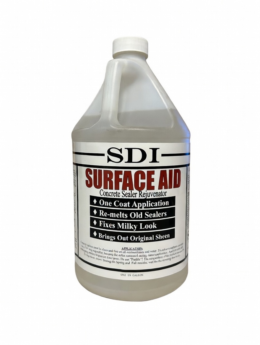 Revitalize your sealed concrete surfaces without the hassle or expense of stripping and reapplying sealer! SDI Surface Aid is a powerful solvent-based rejuvenator that restores heavily coated, solvent-based acrylic sealers that have become worn, damaged, or problematic over time.